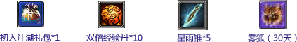 【活动奖励】:初入江湖礼包*1、双倍经验丹*10、星雨锥*5、雾狐(30天)