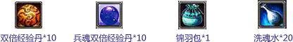 【活动奖励】:双倍经验丹*10、兵魂双倍经验丹*10、锦羽包*1、洗魂水*20