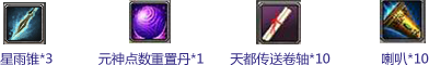 【活动奖励】:星雨锥*3、元神点数重置丹*1、天都传送卷轴*10、喇叭*10